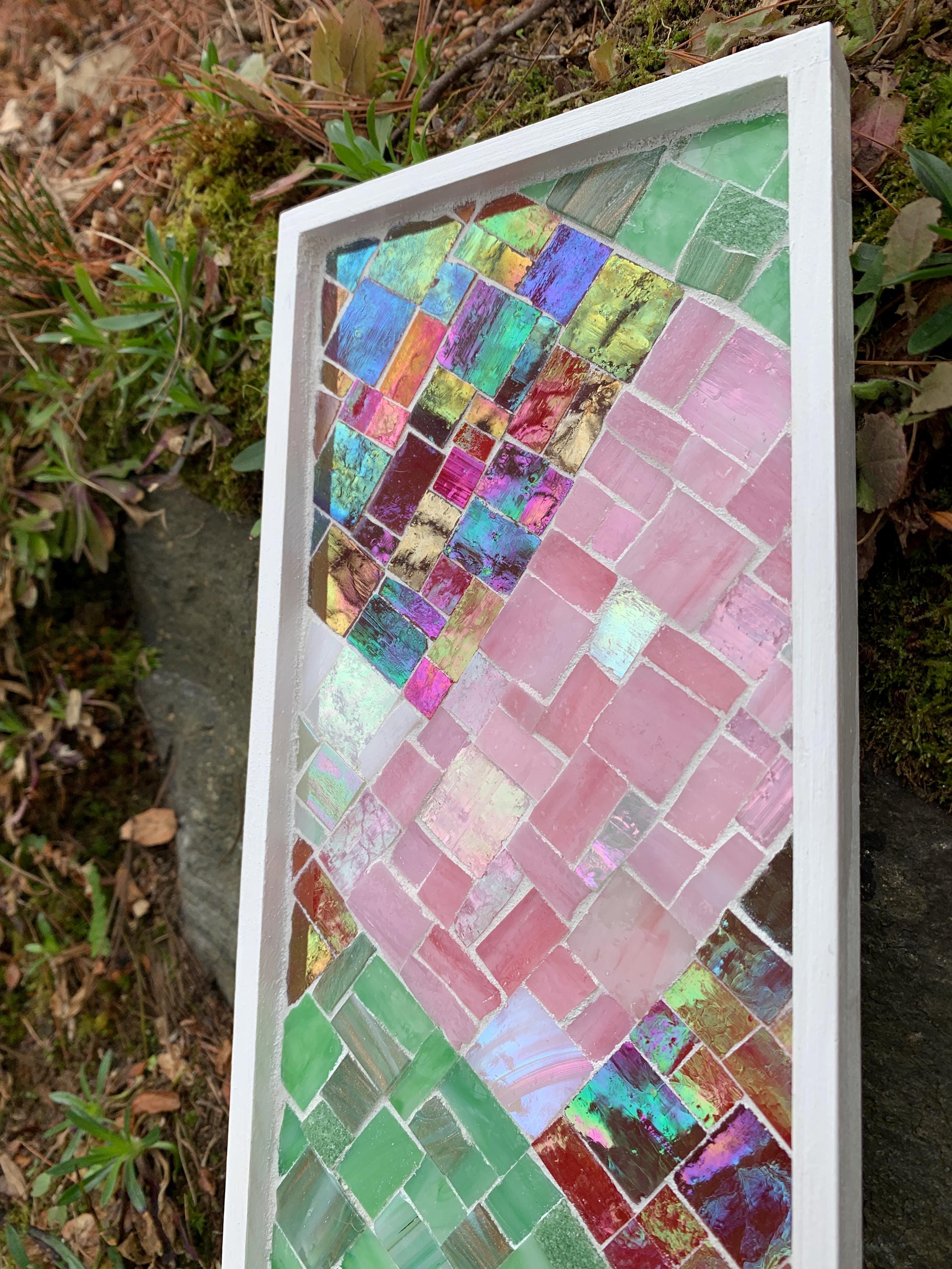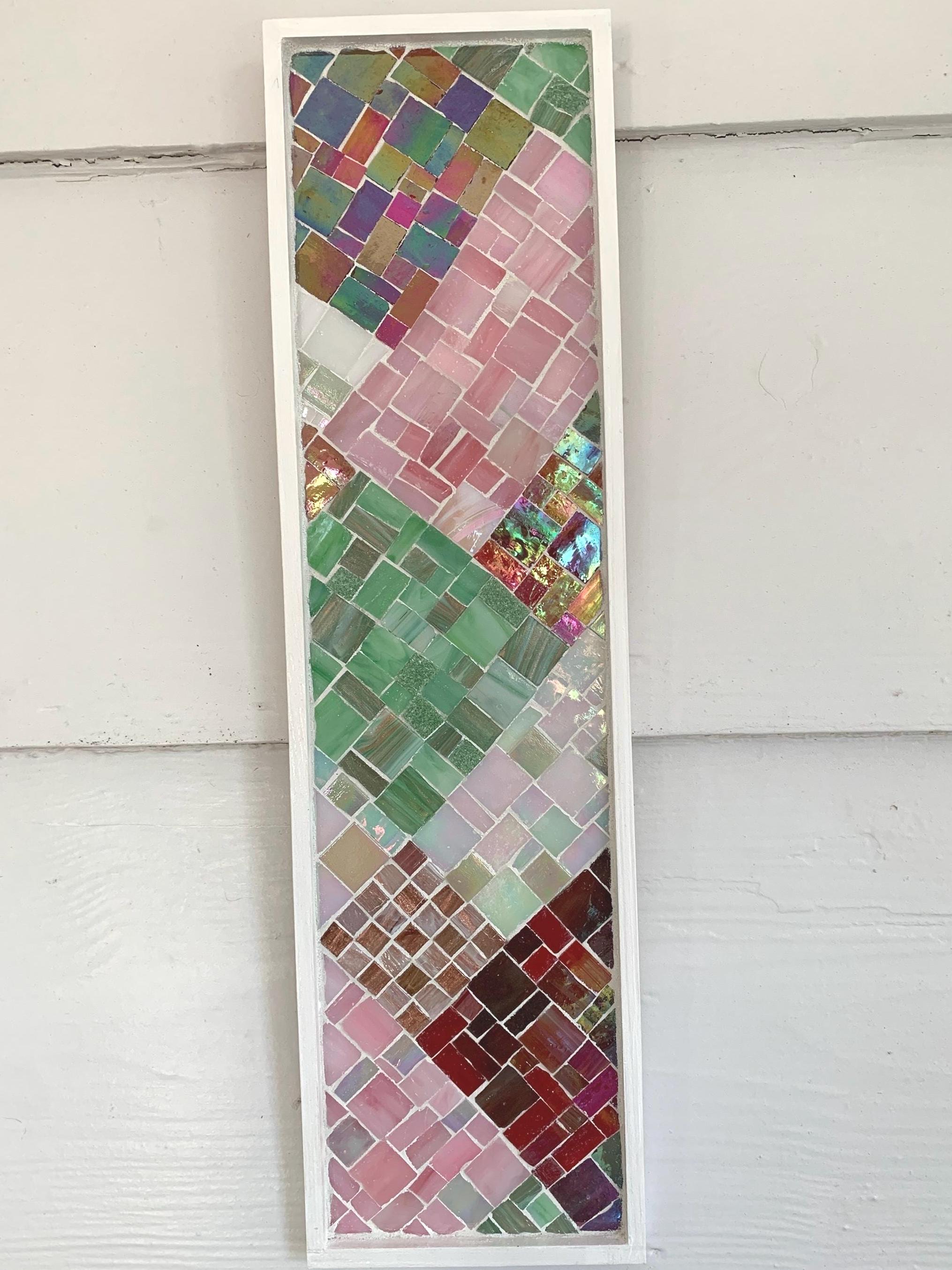 Brighten up your space with this one-of-a-kind mosaic piece featuring a unique mix of Italian vitreous and iridescent glass tiles! Each individual piece is carefully hand-cut and laid by hand, creating a unique composition with rich color and shimmer. The artwork can be displayed either vertically or horizontally, and this piece is 5"x18".