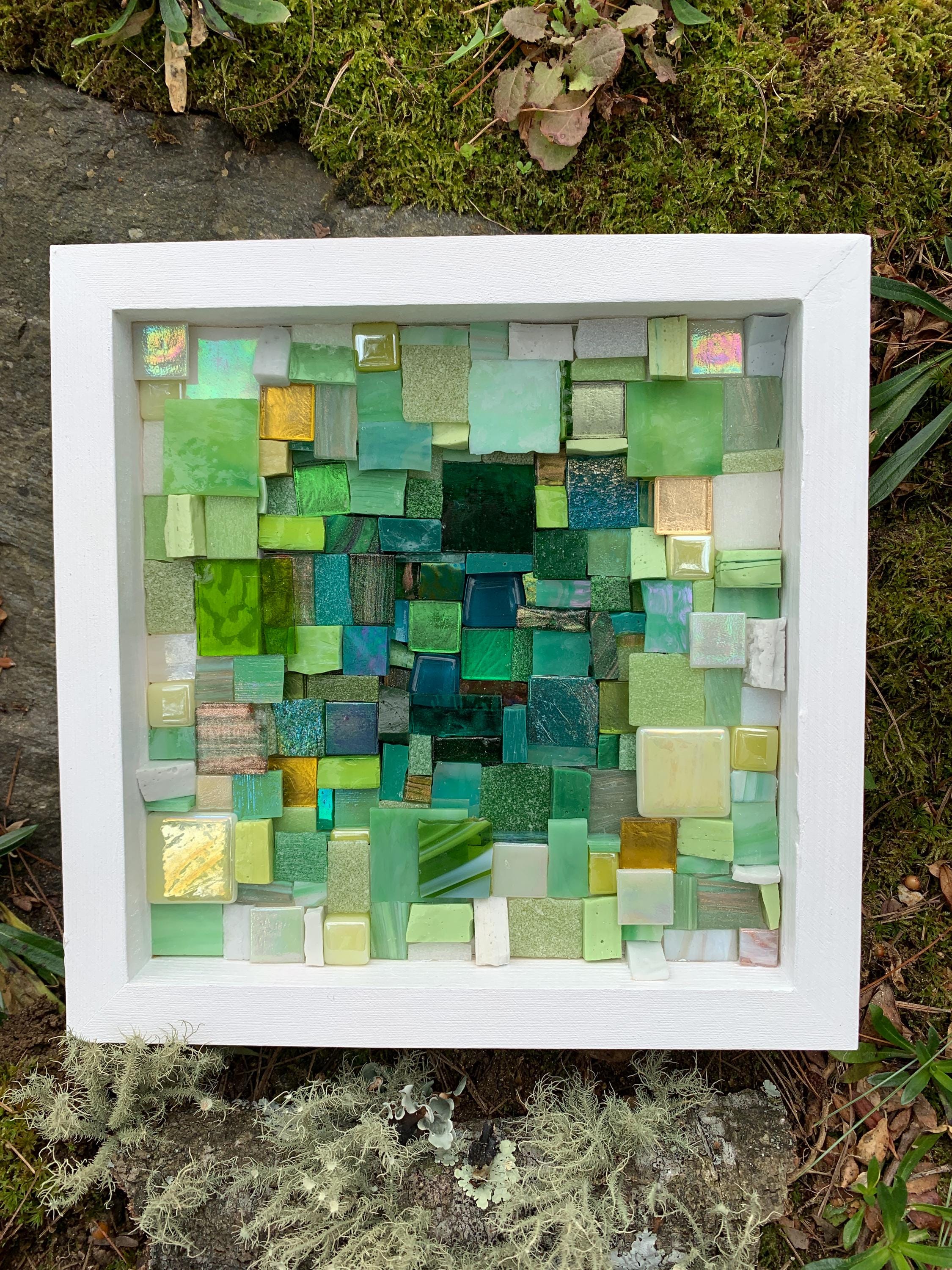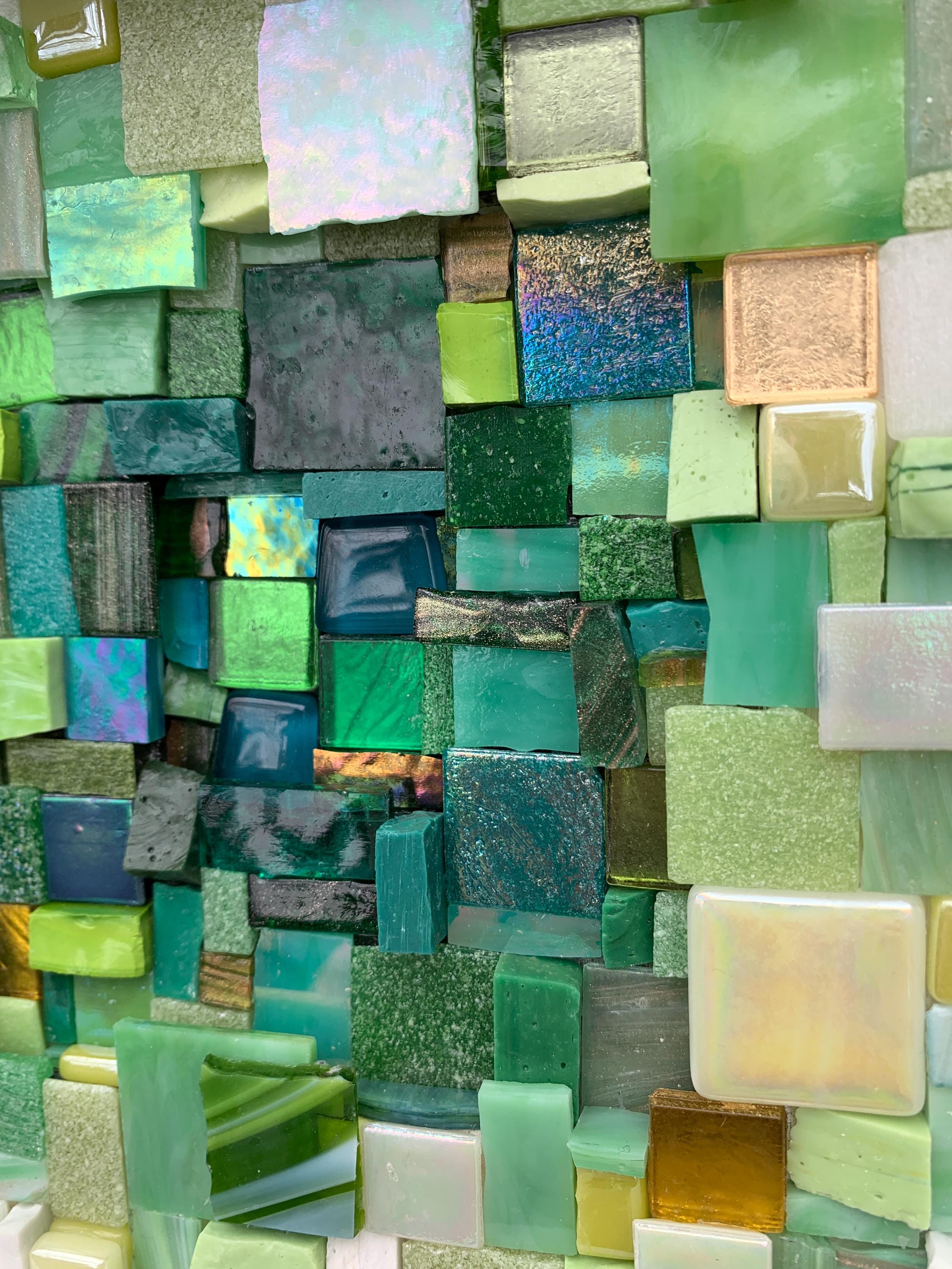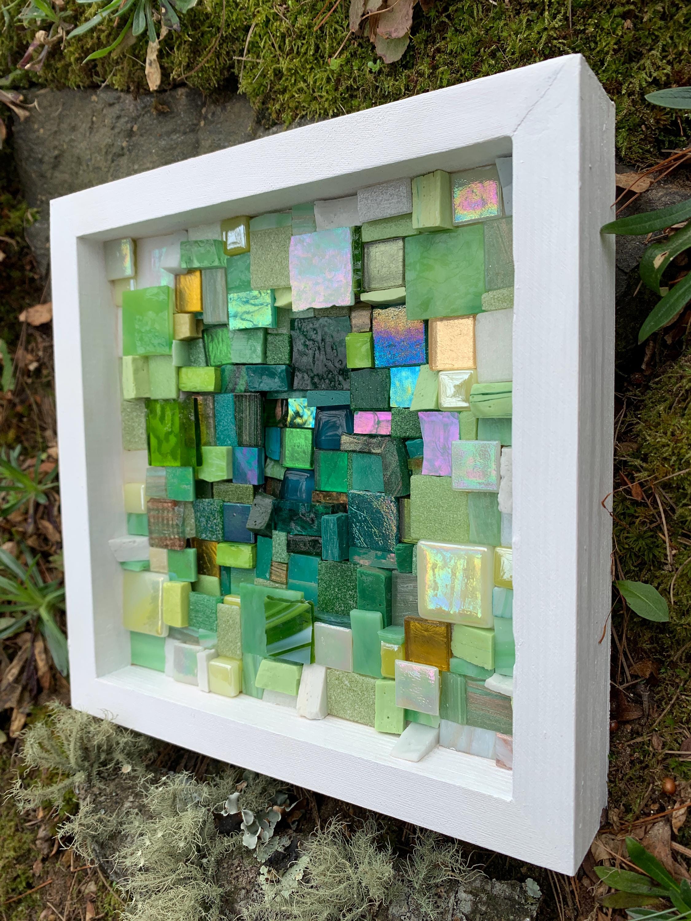 Brighten up your space with this one-of-a-kind mosaic piece featuring a unique mix of Italian vitreous, iridescent and smalti glass tiles! Tiles are carefully hand-cut and fit by hand on a multi-level surface, creating a three dimensional design with rich color and shimmer. All artwork is handmade by me, an actual person in my home studio - not AI, not a print, not a factory. Your walls will thank you for bringing them some sparkle and personality! Outer dimensions of this piece is 8"x8".