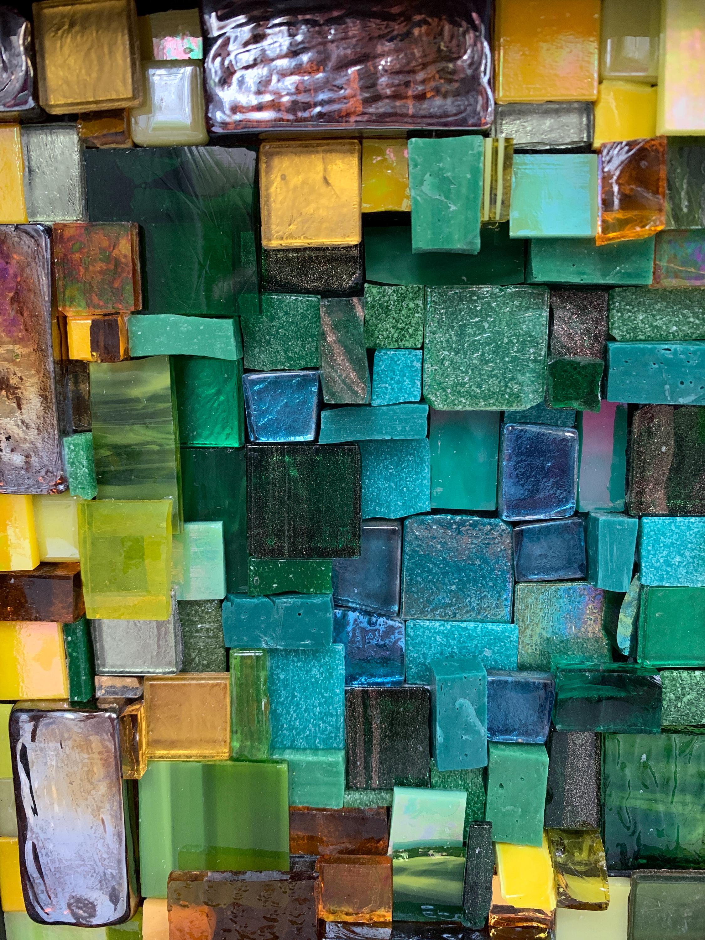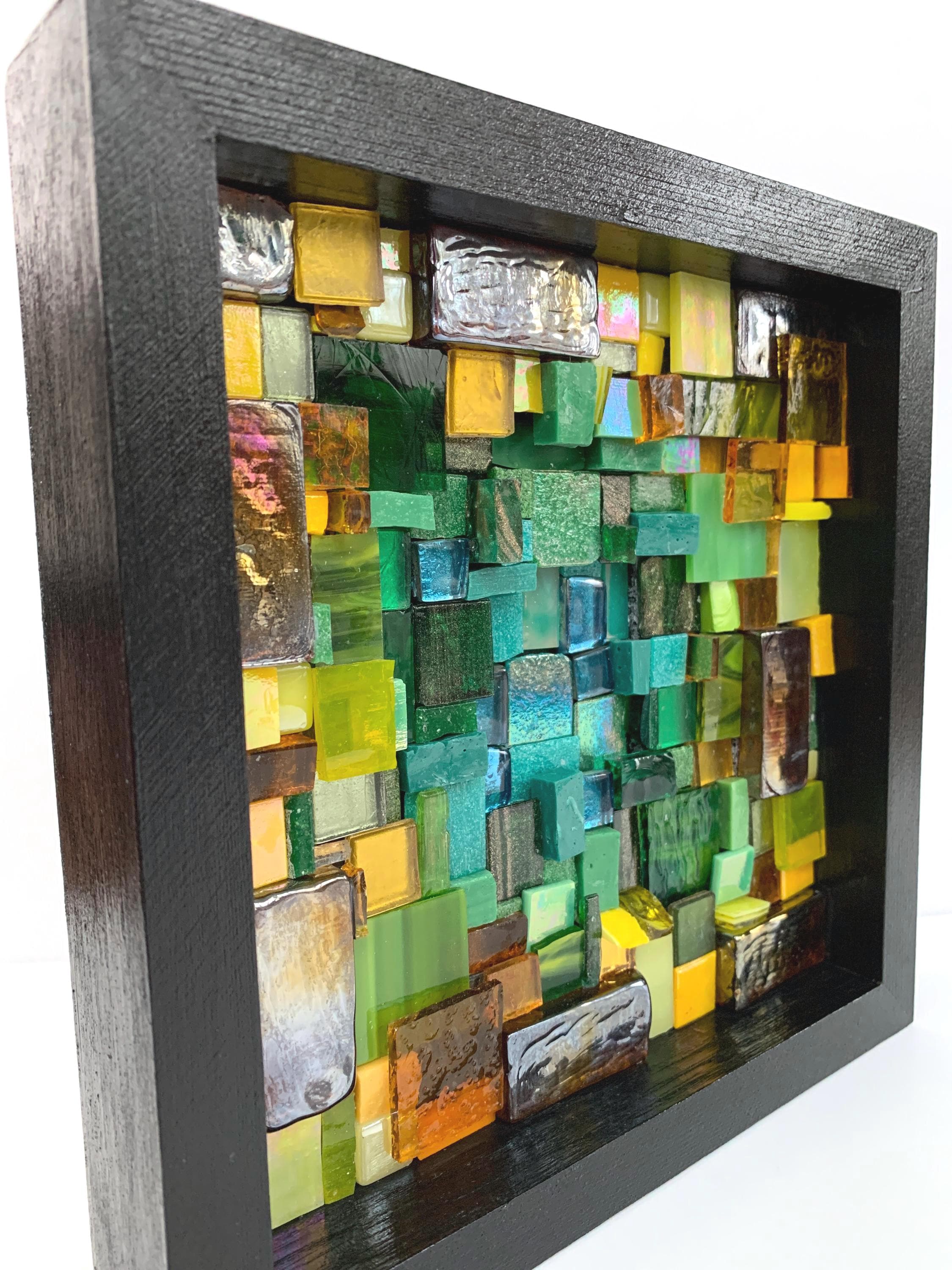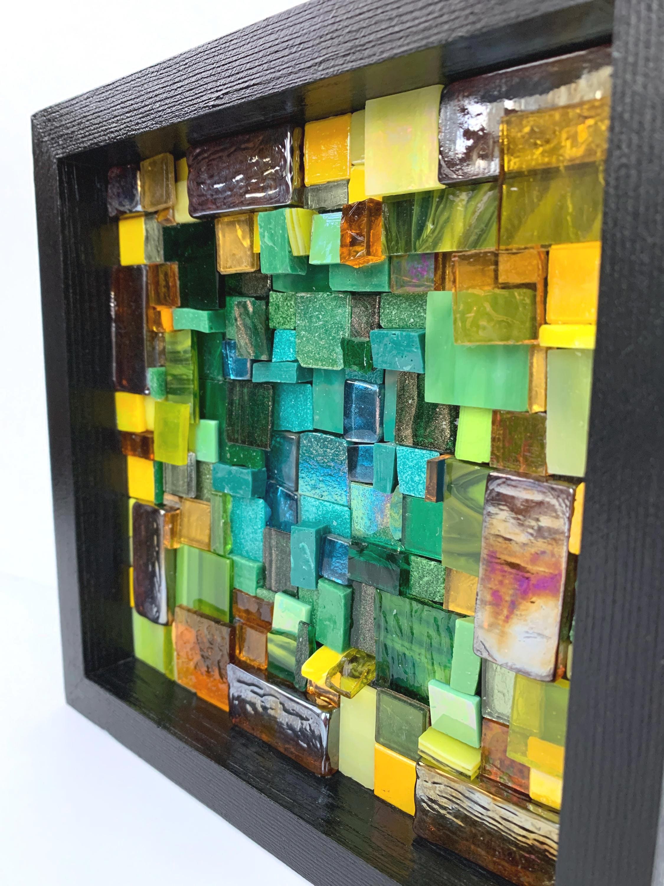 Brighten up your space with this one-of-a-kind mosaic piece featuring a unique mix of Italian vitreous, iridescent and smalti glass tiles! Tiles are carefully hand-cut and fit by hand on a multi-level surface, creating a three dimensional design with rich color and shimmer. All artwork is handmade by me, an actual person in my home studio - not AI, not a print, not a factory. Your walls will thank you for bringing them some sparkle and personality! Outer dimensions of this piece is 8"x8".