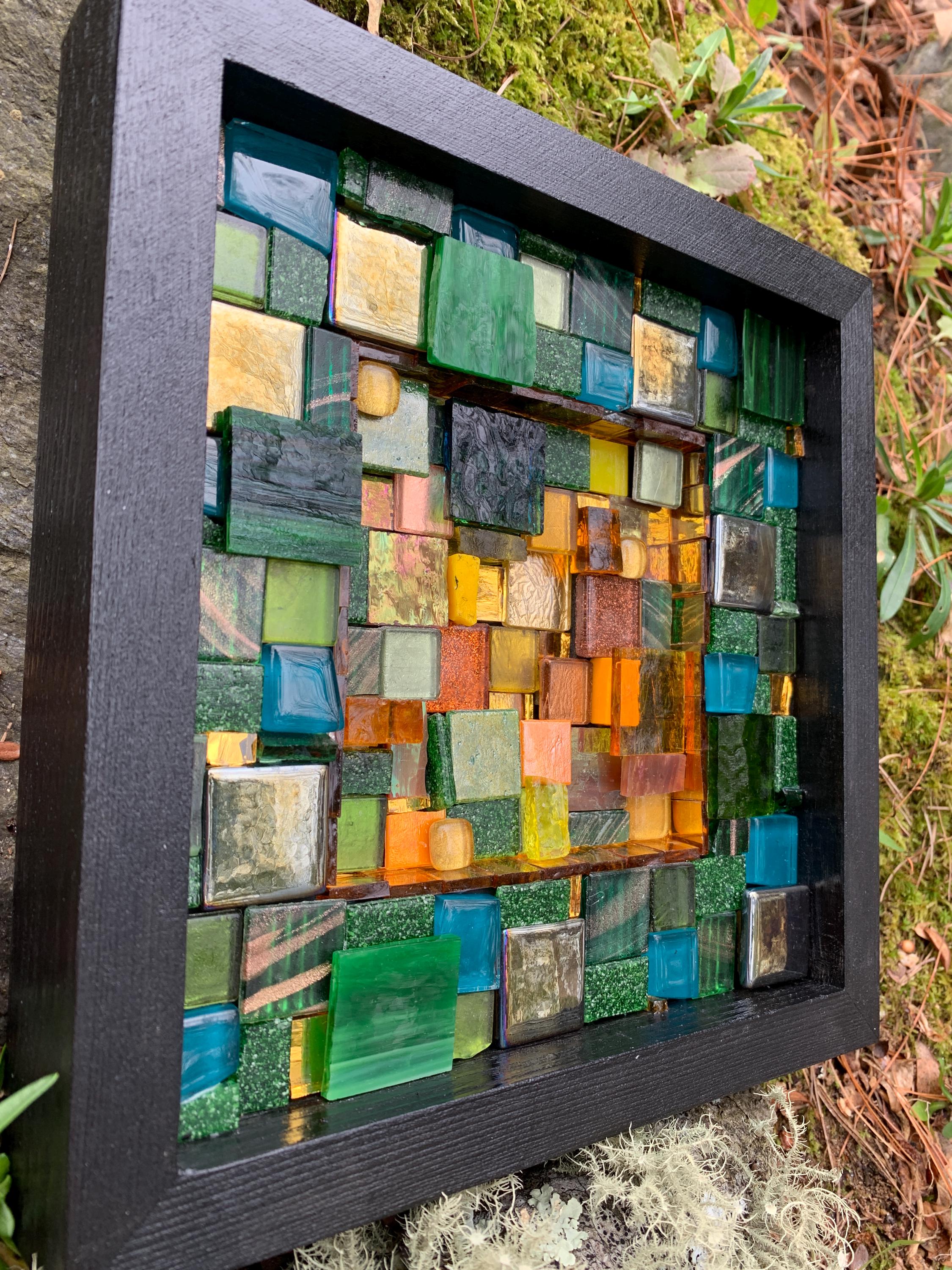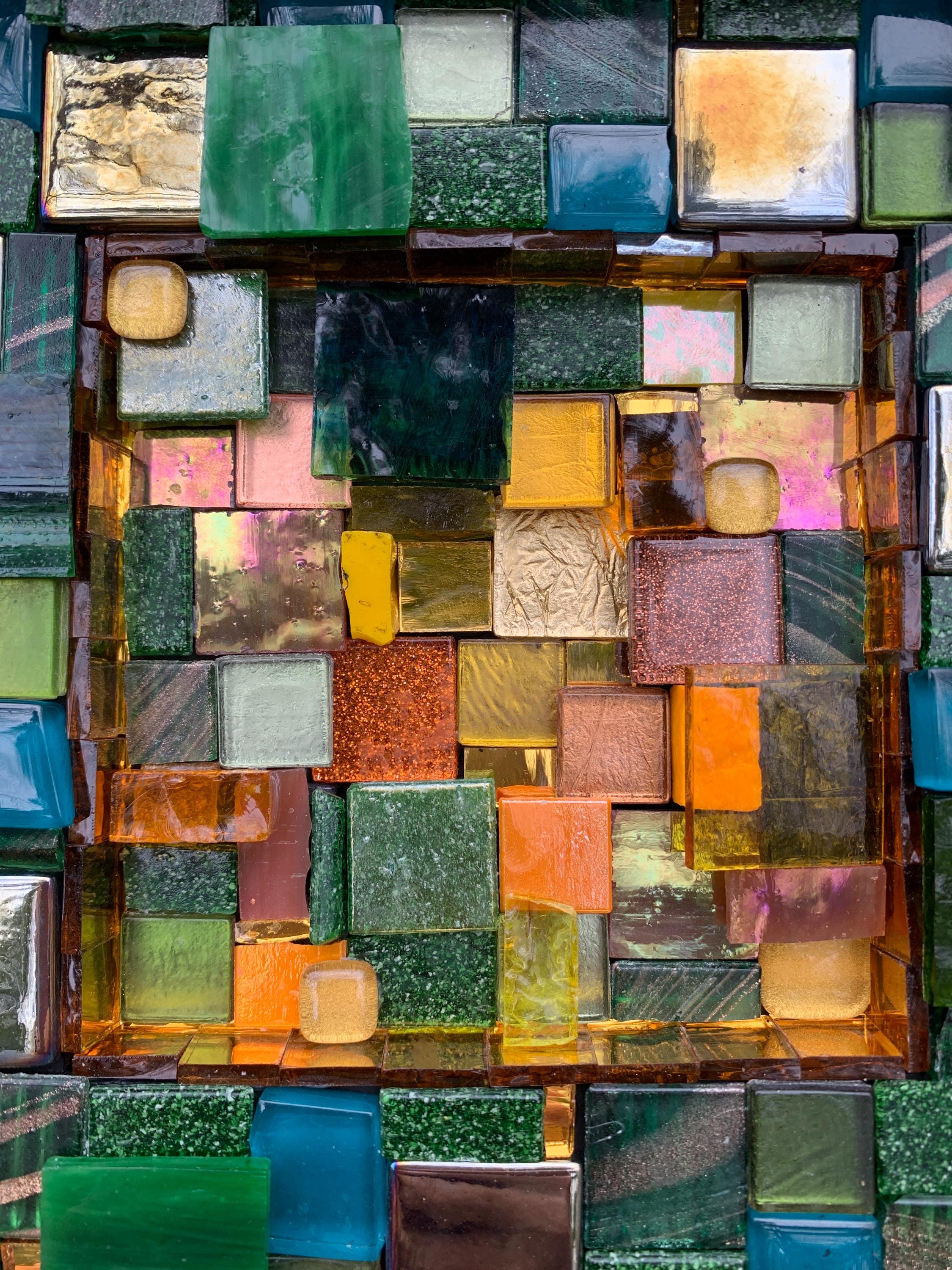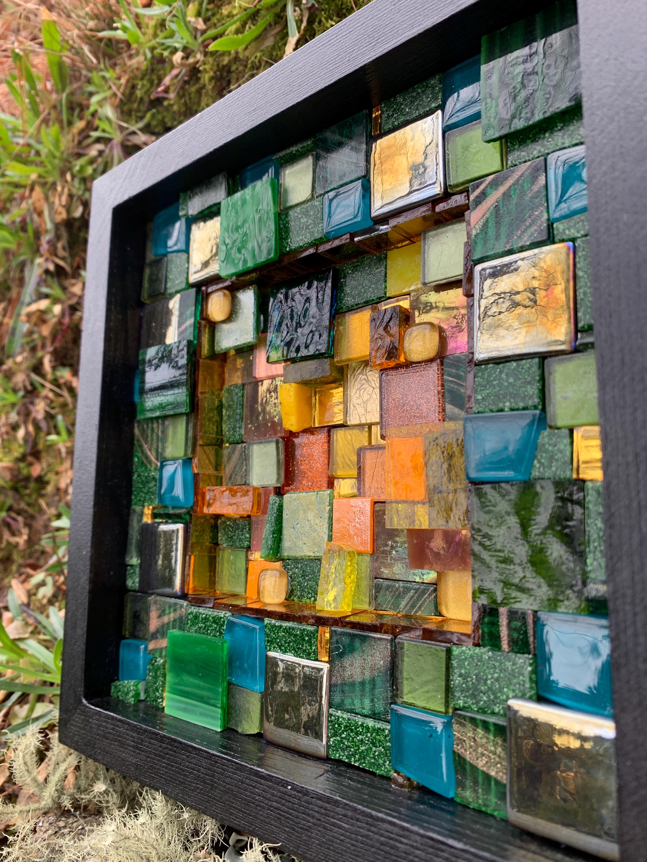 Brighten up your space with this one-of-a-kind mosaic piece featuring a unique mix of Italian vitreous, iridescent and smalti glass tiles! Tiles are carefully hand-cut and fit by hand on a multi-level surface, creating a three dimensional design with rich color and shimmer. All artwork is handmade by me, an actual person in my home studio - not AI, not a print, not a factory. Your walls will thank you for bringing them some sparkle and personality! Outer dimensions of this piece is 8"x8".
